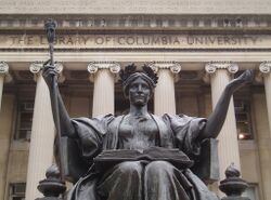 A statue by sculptor Daniel Chester French called Alma Mater is centered on the front steps of Low Memorial Library. McKim, Mead & White invited French to build the sculpture in order to harmonize with the larger composition of the court and library in the center of the campus. Draped in an academic gown, the female figure of Alma Mater wears a crown of laurels and sits on a throne. The scroll-like arms of the throne end in lamps, representing sapientia and doctrina. A book signifying knowledge, balances on her lap, and an owl, the attribute of wisdom, is hidden in the folds of her gown. Her right hand holds a scepter composed of four sprays of wheat, terminating with a crown of King's College which refers to Columbia's origin as a royal charter institution in 1754. A local actress named Mary Lawton was said to have posed for parts of the sculpture. The statue was dedicated on September 23, 1903, as a gift of Mr. & Mrs. Robert Goelet, and was originally covered in golden leaf. During the Columbia University protests of 1968 a bomb damaged the sculpture, but it has since been repaired.[97] The small hidden owl on the sculpture is also the subject of many Columbia legends, the main legend being that the first student in the freshmen class to find the hidden owl on the statue will be valedictorian, and that any subsequent Columbia male who finds it will marry a Barnard student, given that Barnard is a women's college.[98][99]
