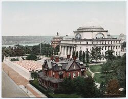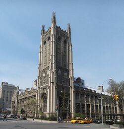 In November 1813, the college agreed to incorporate its medical school with The College of Physicians and Surgeons, a new school created by the Regents of New York, forming Columbia University College of Physicians and Surgeons.[68]:53–60 The college's enrollment, structure, and academics stagnated for the majority of the 19th century, with many of the college presidents doing little to change the way that the college functioned. In 1857, the college moved from the King's College campus at Park Place to a primarily Gothic Revival campus on 49th Street and Madison Avenue, where it remained for the next forty years. During the last half of the 19th century, under the leadership of President F.A.P. Barnard, the president that Barnard College is named after, the institution rapidly assumed the shape of a modern university. Barnard College was created in 1889 as a response to the university's refusal to accept women.[70] By this time, the college's investments in New York real estate became a primary source of steady income for the school, mainly owing to the city's expanding population.[63]:5–8 In 1896, university president Seth Low moved the campus from 49th Street to its present location, a more spacious campus in the developing neighborhood of Morningside Heights.[62][71] Under the leadership of Low's successor, Nicholas Murray Butler, who served for over four decades, Columbia rapidly became the nation's major institution for research, setting the "multiversity" model that later universities would adopt.[20] Prior to becoming the president of Columbia University, Butler founded Teachers College, as a school to prepare home economists and manual art teachers for the children of the poor, with philanthropist Grace Hoadley Dodge.[60] Teachers College is currently affiliated as the university's Graduate School of Education.[72]