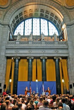 On May 21, 1787, William Samuel Johnson, the son of Dr. Samuel Johnson, was unanimously elected president of Columbia College. Prior to serving at the university, Johnson had participated in the First Continental Congress and been chosen as a delegate to the Constitutional Convention.[69] For a period in the 1790s, with New York City as the federal and state capital and the country under successive Federalist governments, a revived Columbia thrived under the auspices of Federalists such as Hamilton and Jay. Both President George Washington and Vice President John Adams attended the college's commencement on May 6, 1789, as a tribute of honor to the many alumni of the school who had been involved in the American Revolution.[62]:74