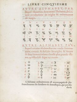 The folios are drawn in black ink on cotton paper watermarked 1809.[1] The text is plain English written from right to left in a simple substitution cryptogram. It uses the Trithemius Cipher, developed in the 16th century. Numerals are substituted by Hebrew letters – Alef=1, Bet=2, etc. Crude drawings of diagrams, magical implements and tarot cards are interspersed in the text. One final page transcribes into French and Latin.[2]