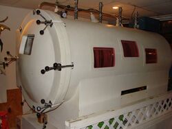 One of the museum's projects is a "hyperbaric biosphere", a chamber which the museum hopes will reproduce the atmospheric conditions that these creationists postulate for Earth before the Great Flood, and enable them to grow dinosaurs. Baugh says that these conditions made creatures live longer, and get larger, smarter and nicer.[6] He claims that tests under these conditions have tripled the lifespan of fruit-flies, and detoxified copperhead snakes. A much larger version is under construction in the new building.[2]