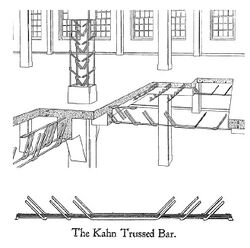 This new style constructed steel beam was called "the Kahn trussed bar", sometimes shortened to just "the Kahn bar".[6] The trussed steel bar had bent-up "wings" on each side. The "wings" on the steel bar provided 20–30% additional strength to a reinforced concrete beam over the old technology of plain straight smooth steel bars or rods.[2] The primary concept of the Kahn bar was that it gave reinforcement in both the vertical and horizontal plane while it simplified construction.({{{1}}}, {{{2}}}) The principal lines of shear stresses in a beam average a 45-degree angle, so the angled "wings" transmitted the tension down to the main reinforcing steel beam.[3]