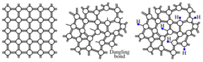 The material can be passivated by hydrogen, which bonds to the dangling bonds and can reduce the dangling bond density by several orders of magnitude. Hydrogenated amorphous silicon (a-Si:H) has a sufficiently low amount of defects to be used within devices such as solar photovoltaic cells, particularly in the protocrystalline growth regime.[1] However, hydrogenation is associated with light-induced degradation of the material, termed the Staebler–Wronski effect.[2]
