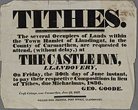 The collection of tithes was resisted in the period 1831–36, known as the Tithe War. Thereafter, tithes were reduced and added to rents with the passing of the Tithe Commutation Act in 1836. With the disestablishment of the Church of Ireland by the Irish Church Act 1869, tithes were abolished.