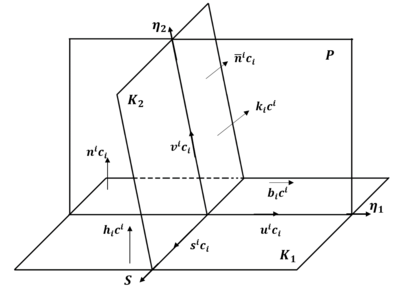 The twin plane, shear direction, and shear plane form the basis vectors of an orthogonal set. The axis-angle misorientation relationship between the parent and twin is a rotation of angle 𝜉 about the shear plane's normal direction 𝑷.