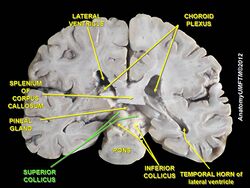 The superior colliculus (SC) or optic tectum (OT) is part of the tectum, located in the midbrain, superior to the brainstem and inferior to the thalamus. It contains seven layers of alternating white and grey matter, of which the superficial contain topographic maps of the visual field; and deeper layers contain overlapping spatial maps of the visual, auditory and somatosensory modalities.[69] The structure receives afferents directly from the retina, as well as from various regions of the cortex (primarily the occipital lobe), the spinal cord and the inferior colliculus. It sends efferents to the spinal cord, cerebellum, thalamus and occipital lobe via the lateral geniculate nucleus (LGN). The structure contains a high proportion of multisensory neurons and plays a role in the motor control of orientation behaviours of the eyes, ears and head.[53]
