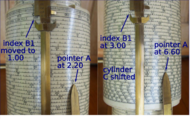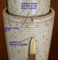 For model 2 instruments with scales on the inner cylinder D, there is an index mark inscribed on both the top and bottom edges of cylinder C. As an example of use, when the lower index mark is set to an angle printed on the lower scale on cylinder D, pointer A points to the corresponding value of sine on cylinder C. The same approach apples for the log scale on the upper part of cylinder D.[note 12] The model 3 Fuller–Bakewell is used in the same way but its scales on cylinder D are for cosine² and sine⋅cosine[note 1][note 2](see photograph).[61]
