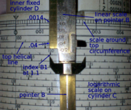 The instrument operates on the principle that two pointers are set at an appropriate separation on the helical scale of the calculator. The relevant numbers are indexed by adjusting separately both the movable cylinder and the movable pointer. Since the scale is logarithmic the separation represents the ratio of the numbers. If the cylinder is then moved without altering the positions of the pointers, this same ratio applies between any other pair of numbers addressed.[53] In other words, it is a logarithmic Gunter's scale wound into a helix with Gunter's compass points being provided by pointers A and B.[54]
