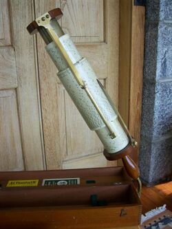 In essence, the calculator consists of three separate hollow cylindrical parts that can twist and slide over each other about a common axis without any tendency to slip. The following details describe the version made between 1921 and 1935. There is a papier-mâché cylinder (marked D in the annotated photograph) some 30 centimetres (12 inches) long and 6.2 centimetres (2.4 in) in diameter fastened to a mahogany handle. A second papier-mâché cylinder (marked C) – 16.3 centimetres (6.4 in) long and 8.1 centimetres (3.2 in) diameter – is a slide fit over the first. Both cylinders are covered in paper varnished with shellac. The second, outer, cylinder is printed with the slide rule's primary logarithmic scale in the form of a 50-turn helix 12.70 metres; 500 inches (41 ft 8 in) long with annotations on the scale going from 100 to 1000. A brass tube with a mahogany cap at the top is a slide fit into the first cylinder.[1][2][3][4]