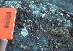 - ↑ Previously, the quarry was exposed on County Route 8 in Mineral County, aka Waxler Road, but Waxler Road was moved to connect its more westward section to Route 46. The quarry is on private property, the site of the now closed Faulks Brothers Scrap Yard. It is visible on Google Maps at 39.43917865242232, -78.95964425171306