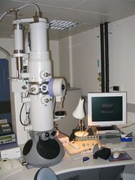The two major types of electron microscopes are transmission electron microscopes (TEMs) and scanning electron microscopes (SEMs).[21][22] They both have series of electromagnetic and electrostatic lenses to focus a high energy beam of electrons on a sample. In a TEM the electrons pass through the sample, analogous to basic optical microscopy.[21] This requires careful sample preparation, since electrons are scattered strongly by most materials.[22] The samples must also be very thin (below 100 nm) in order for the electrons to pass through it.[21][22] Cross-sections of cells stained with osmium and heavy metals reveal clear organelle membranes and proteins such as ribosomes.[22] With a 0.1 nm level of resolution, detailed views of viruses (20 – 300 nm) and a strand of DNA (2 nm in width) can be obtained.[22] In contrast, the SEM has raster coils to scan the surface of bulk objects with a fine electron beam. Therefore, the specimen do not necessarily need to be sectioned, but coating with a nanometric metal or carbon layer may be needed for nonconductive samples.[21] SEM allows fast surface imaging of samples, possibly in thin water vapor to prevent drying.[21][22]