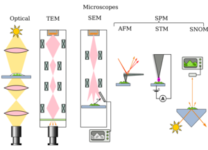 The different types of scanning probe microscopes arise from the many different types of interactions that occur when a small probe is scanned over and interacts with a specimen. These interactions or modes can be recorded or mapped as function of location on the surface to form a characterization map. The three most common types of scanning probe microscopes are atomic force microscopes (AFM), near-field scanning optical microscopes (NSOM or SNOM, scanning near-field optical microscopy), and scanning tunneling microscopes (STM).[28] An atomic force microscope has a fine probe, usually of silicon or silicon nitride, attached to a cantilever; the probe is scanned over the surface of the sample, and the forces that cause an interaction between the probe and the surface of the sample are measured and mapped. A near-field scanning optical microscope is similar to an AFM but its probe consists of a light source in an optical fiber covered with a tip that has usually an aperture for the light to pass through. The microscope can capture either transmitted or reflected light to measure very localized optical properties of the surface, commonly of a biological specimen. Scanning tunneling microscopes have a metal tip with a single apical atom; the tip is attached to a tube through which a current flows.[29] The tip is scanned over the surface of a conductive sample until a tunneling current flows; the current is kept constant by computer movement of the tip and an image is formed by the recorded movements of the tip.[28]