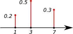 A discrete probability distribution is often represented with Dirac measures, the probability distributions of deterministic random variables. For any outcome [math]\displaystyle{ \omega }[/math], let [math]\displaystyle{ \delta_\omega }[/math] be the Dirac measure concentrated at [math]\displaystyle{ \omega }[/math]. Given a discrete probability distribution, there is a countable set [math]\displaystyle{ A }[/math] with [math]\displaystyle{ P(X \in A) = 1 }[/math] and a probability mass function [math]\displaystyle{ p }[/math]. If [math]\displaystyle{ E }[/math] is any event, then [math]\displaystyle{ P(X \in E) = \sum_{\omega \in A} p(\omega) \delta_\omega(E), }[/math] or in short, [math]\displaystyle{ P_X = \sum_{\omega \in A} p(\omega) \delta_\omega. }[/math]