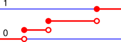 A real-valued discrete random variable can equivalently be defined as a random variable whose cumulative distribution function increases only by jump discontinuities—that is, its cdf increases only where it "jumps" to a higher value, and is constant in intervals without jumps. The points where jumps occur are precisely the values which the random variable may take. Thus the cumulative distribution function has the form [math]\displaystyle{ F(x) = P(X \leq x) = \sum_{\omega \leq x} p(\omega). }[/math]