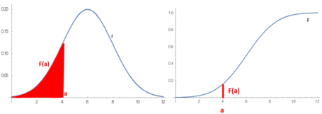 Absolutely continuous probability distributions can be described in several ways. The probability density function describes the infinitesimal probability of any given value, and the probability that the outcome lies in a given interval can be computed by integrating the probability density function over that interval.[4] An alternative description of the distribution is by means of the cumulative distribution function, which describes the probability that the random variable is no larger than a given value (i.e., [math]\displaystyle{ \ \boldsymbol\mathcal{P}(X \lt x)\ }[/math] for some [math]\displaystyle{ \ x\ }[/math]). The cumulative distribution function is the area under the probability density function from [math]\displaystyle{ \ -\infty\ }[/math] to [math]\displaystyle{ \ x\ , }[/math] as described by the picture to the right.[5]