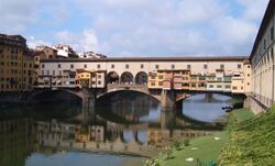 One of the bridges in particular stands out – the Ponte Vecchio (Old Bridge), whose most striking feature is the multitude of shops built upon its edges, held up by stilts. The bridge also carries Vasari's elevated corridor linking the Uffizi to the Medici residence (Palazzo Pitti). Although the original bridge was constructed by the Etruscans, the current bridge was rebuilt in the 14th century. It is the only bridge in the city to have survived World War II intact. It is the first example in the western world of a bridge built using segmental arches, that is, arches less than a semicircle, to reduce both span-to-rise ratio and the numbers of pillars to allow lesser encumbrance in the riverbed (being in this much more successful than the Roman Alconétar Bridge).
