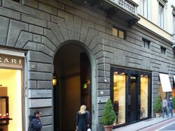By the year 1300 Florence had become a centre of textile production in Europe. Many of the rich families in Renaissance Florence were major purchasers of locally produced fine clothing, and the specialists of fashion in the economy and culture of Florence during that period is often underestimated.[93] Florence is regarded by some as the birthplace and earliest centre of the modern (post World War Two) fashion industry in Italy. The Florentine "soirées" of the early 1950s organised by Giovanni Battista Giorgini were events where several Italian designers participated in group shows and first garnered international attention.[94] Florence has served as the home of the Italian fashion company Salvatore Ferragamo since 1928. Gucci, Roberto Cavalli, and Emilio Pucci are also headquartered in Florence. Other major players in the fashion industry such as Prada and Chanel have large offices and stores in Florence or its outskirts. Florence's main upscale shopping street is Via de' Tornabuoni, where major luxury fashion houses and jewellery labels, such as Armani and Bulgari, have boutiques. Via del Parione and Via Roma are other streets that are also well known for their high-end fashion stores.[95]