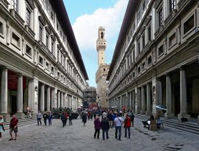 ![]() A collage of Florence showing the Galleria degli Uffizi (top left), followed by the Palazzo Pitti, a sunset view of the city and the Fountain of Neptune in the Piazza della Signoria | |