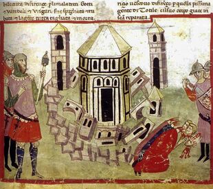 The Scoppio del Carro ("Explosion of the Cart") is a celebration of the First Crusade. During the day of Easter, a cart, which the Florentines call the Brindellone and which is led by four white oxen, is taken to the Piazza del Duomo between the Baptistery of St. John the Baptist (Battistero di San Giovanni) and the Florence Cathedral (Santa Maria del Fiore). The cart is connected by a rope to the interior of the church. Near the cart there is a model of a dove, which, according to legend, is a symbol of good luck for the city: at the end of the Easter mass, the dove emerges from the nave of the Duomo and ignites the fireworks on the cart.