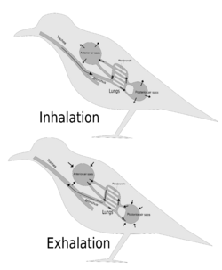 John Ruben et al. (1997, 1999, 2003, 2004) disputed this and suggested that dinosaurs had a "tidal" respiratory system (in and out) powered by a crocodile-like hepatic piston mechanism – muscles attached mainly to the pubis pull the liver backwards, which makes the lungs expand to inhale; when these muscles relax, the lungs return to their previous size and shape, and the animal exhales. They also presented this as a reason for doubting that birds descended from dinosaurs.[20][21][22][23][24]