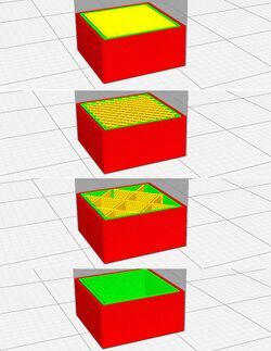 Different densities of infill (in yellow), as generated by Cura slicer, from solid to hollow.