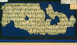 Manuscripts preserve the Tocharian language, a branch of the Indo-European language family spoken in the Tarim Basin of western China between the 5th century and the 8th century and likely extinct by the 9th century. The documents record three closely related languages, called Tocharian A (also East Tocharian, Agnean, or Turfanian), Tocharian B (West Tocharian or Kuchean), and Tocharian C (Kroränian, Krorainic, or Lolanisch). The subject matter of the texts suggests that Tocharian A was more archaic and used as a Buddhist liturgical language, while Tocharian B was more actively spoken in the entire area from Turfan in the east to Tumshuq in the west. Tocharian C is only attested in a few Kharoṣṭhī script texts from Krorän, as well as a body of loanwords and names found in Prakrit documents from the Lop Nor basin.[75]
