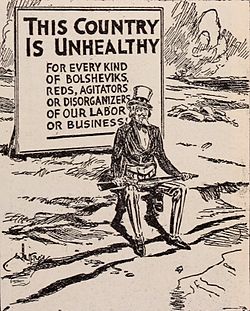 Membership declined dramatically in the late 1910s and 1920s. There were conflicts with other labor groups, particularly the American Federation of Labor (AFL), which regarded the IWW as too radical, while the IWW regarded the AFL as too conservative and opposed their decision to divide workers on the basis of their trades.[9] Membership also declined due to government crackdowns on radical, anarchist, and socialist groups during the First Red Scare after World War I. In Canada, the IWW was outlawed by the federal government by an Order in Council on September 24, 1918.[10]