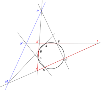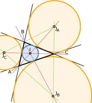 In a triangle, three intersection points, two of them between an interior angle bisector and the opposite side, and the third between the other exterior angle bisector and the opposite side extended, are collinear.[1]:p. 149