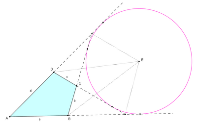 An ex-tangential quadrilateral is a quadrilateral for which there exists a circle that is tangent to all four extended sides. The excenter (center of the tangent circle) lies at the intersection of six angle bisectors. These are the internal angle bisectors at two opposite vertex angles, the external angle bisectors (supplementary angle bisectors) at the other two vertex angles, and the external angle bisectors at the angles formed where the extensions of opposite sides intersect.