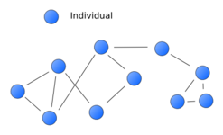 The density of a given social network is found by dividing the number of all existing links between the actors by the number of potential links within the same set of actors.[2] The higher the resulting number, the denser a network is. Dense networks are most likely to be found in small, stable communities with few external contacts and a high degree of social cohesion. Loose social networks, by contrast, are more liable to develop in larger, unstable communities that have many external contacts and exhibit a relative lack of social cohesion.[3]