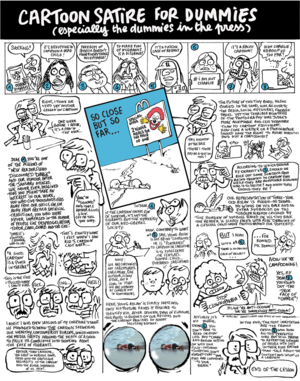 The whole outrage and commentary may not even be relevant. Given the cartoon's history of double-takes, rather than having mocked victims of a hurricane or having generalized them as Neo-Nazis, that particular cartoon may have instead attempted to mock the tendency of religious evangelicals appropriating natural disasters as God's punishment for a demographic they hate, such as punishment for legalizing gay marriage.[57] Regardless, discussion likely should've revolved around how this cartoon conveyed its message, as its intents were lost, but the media, reveling in outrageous headlines, have barely even mentioned, if at all, as a possibility.