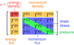 The stress–energy tensor (sometimes stress–energy–momentum tensor or energy–momentum tensor) is a tensor quantity in physics that describes the density and flux of energy and momentum in spacetime, generalizing the stress tensor of Newtonian physics. It is an attribute of matter, radiation, and non-gravitational force fields. The stress–energy tensor is the source of the gravitational field in the Einstein field equations of general relativity, just as mass density is the source of such a field in Newtonian gravity. Because this tensor has 2 indices (see next section) the Riemann curvature tensor has to be contracted into the Ricci tensor, also with 2 indices.