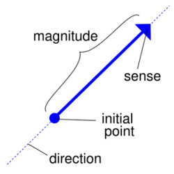 In mathematics, physics, and engineering, a Euclidean vector (sometimes called a geometric[1] or spatial vector,[2] or – as here – simply a vector) is a geometric object that has both a magnitude (or length) and direction. A vector is what is needed to "carry" the point A to the point B; the Latin word vector means "one who carries".[3] The magnitude of the vector is the distance between the two points and the direction refers to the direction of displacement from A to B. Many algebraic operations on real numbers such as addition, subtraction, multiplication, and negation have close analogues for vectors, operations which obey the familiar algebraic laws of commutativity, associativity, and distributivity.