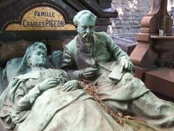 After his death he remains noted for his family grave in Montparnasse Cemetery in Paris, which he commissioned in 1905 to hold up to 18 family members. The main feature is a life-sized bronze sculpture[1] of Pigeon (notebook and pencil in hand) and his wife lying on a bed, overlooked by an angel, which had been illuminated by a lamp for many years by his custodians[2].