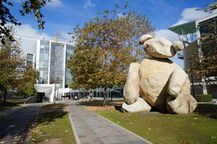 The collection also includes a work by Alexis Smith consisting of a path made of a large coiling snake whose head guides towards Geisel Library, with a quote from John Milton's Paradise Lost carved along its length: "And wilt thou not be loath to leave this Paradise, but shalt possess a Paradise within thee, happier far." The path circles around its own garden and a large granite book-shaped block. One of the newest additions to the collection is Tim Hawkinson's giant teddy bear made of six boulders located in between the newly constructed Calit2 buildings.[65] Another notable campus sight was the graffiti staircase of Mandeville Hall, a series of corridors that had been tagged with graffiti by generations of students over decades of use; this was recently replaced with the Graffiti Art Park.[66] Students in the university's visual arts department also create temporary public art installations as part of their coursework. In 2007, the university sponsored a $56,000 performance art project to develop a sense of community at the sprawling campus.[67]
