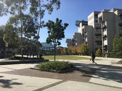 UC San Diego is located in the residential neighborhood of La Jolla of northern San Diego, bordered by the communities of La Jolla Shores, Torrey Pines, and University City. The main campus consists of 761 buildings that occupy 1,152 acres (466 ha), with natural reserves covering about 889 acres (360 ha) and outlying facilities taking up the remaining area.[11] The San Diego Freeway (Interstate 5) passes through the campus and separates Jacobs Medical Center and Mesa apartment housing from the greater part of the university. The Preuss School, a college-preparatory charter school established and administered by UC San Diego, also lies on the eastern portion of the campus.[49]