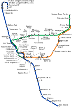 Additionally, since November 21, 2021, the university can be accessed by the San Diego Trolley. On that day, the existing Blue Line was extended north from Downtown San Diego to UC San Diego and the University City area, the culmination of construction starting in 2016. The extension gave the campus two trolley stations: UC San Diego Health La Jolla and UC San Diego Central Campus.[75] A major goal of the project is to ease traffic and parking on campus while providing more accessible transportation to nearby areas. As part of the university's existing public transit partnerships, all students have unlimited access to MTS regional buses and trolleys, as well as most North County Transit District transportation services, upon paying a "transportation fee" as part of registration.[76]