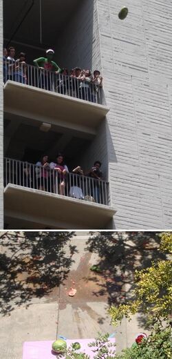 Another popular campus tradition is the Watermelon Drop, which takes place at the end of the spring quarter.[199] The Watermelon Drop is one of the campus' oldest traditions, famously originating in 1965 from a physics exam question centering on the velocity on impact of a dropped object. A group of intrigued students pursued that line of thought by dropping a watermelon from the top floor of Revelle's Urey Hall to measure the distance from the splat to the farthest travelling piece of fruit.