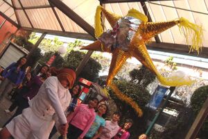 Individuals may play the various parts of Mary (María) and Joseph (José), with the expectant mother riding a real donkey, attendants such as angels and shepherds joining along the way, or pilgrims who may carry images of the holy personages instead, while children may carry poinsettias.[9] The procession is followed by musicians, with the entire procession singing posadas such as pedir posada.[4] At the end of each night, Christmas carols are sung, children break open star-shaped piñatas and everyone sits for a feast.[4][10] The piñatas used during the holiday are traditionally made out of clay.