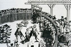 The town of Roscommon has the distinction of having had Ireland's most notorious hangwoman, Lady Betty, who was given the post in exchange for her life being spared when the hangman due to execute her death sentence took ill on the day that she and 25 others were due to be hanged. Lady Betty offered to carry out the task in exchange for her death sentence being commuted to a life sentence, and she acted as the county's hangwoman from then on.[5] An unidentified woman hanged two men for murder on 13 November 1782 at Kilmainham, near Dublin. The men were also quartered. The sheriff received abuse for making a hangman of a woman.[6]