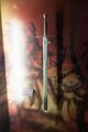 High Court Executioner's sword with Christian epigram, ca. 1760 Salzburg, Austria, on display next to a Bishop's staff. The executioner's sword is designed as a cutting weapon rather than stabbing, forged of brass and iron.