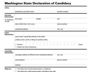 Any person who desires to be a write-in candidate and have his or her votes counted at a primary or general election can file a declaration of candidacy with the Washington Secretary of State and the Washington Public Disclosure Commission up to 8:00 p.m. on the day of the primary or general election. A declaration of candidacy for a write-in candidate must be accompanied by a filing fee or a filing fee petition with the required signatures if filing within 18 days of the election (fees and signature requirements are the same as those summarized above).[40]
