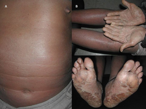 | (A) erythematous and finely scaling lesions on the trunk; (B, C) palmo-plantar keratoderma | |
