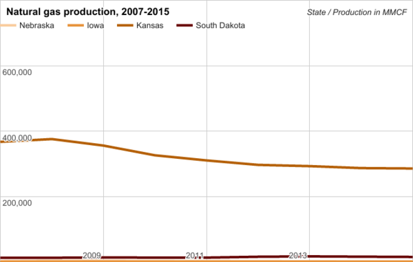 Natural gas production in Nebraska and neighboring states (2007-2015)