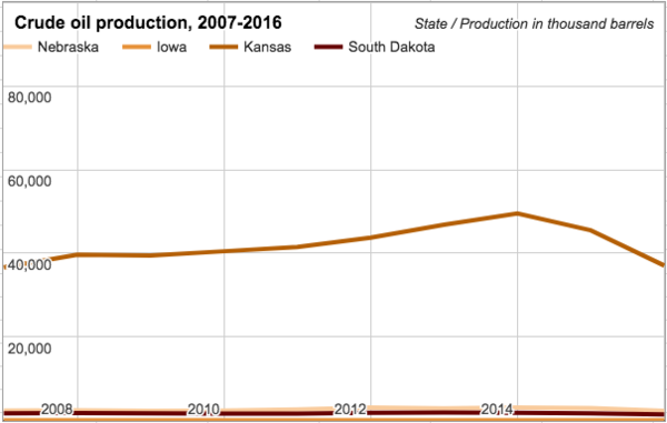 Crude oil production in Nebraska and neighboring states (2007-2016)
