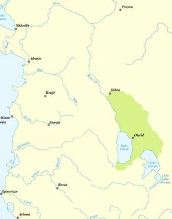 The Principality of Dukagjini (Albanian: Principata e Dukagjinit) refers to the domains of the Albanian Dukagjini family in northern Albania and western Kosovo in the 14th century and 15th century. At their maximum extent, the domains of the Dukagjini extended from Upper Zadrima in the northwest to the Plain of Dukagjini in western Kosovo.[4] The political center of the Dukagjini family was Lezhë until 1393 when it was surrendered to Venice in order to not fall under the Ottomans. The Ottoman sanjak of Dukagjin was named after the rule of the family in the areas that formed it.[5] The principality formally existed until 1479, but in 1444 it was united by Skanderbeg with the other Albanian noble families.