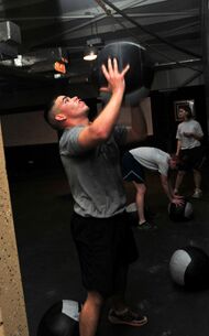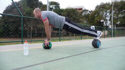 A medicine ball (also known as an exercise ball, a med ball, or a fitness ball) is a weighted ball whose diameter is about a shoulder-width, (approx. 13.7 inches (350 mm)), often used for rehabilitation and strength training.[1] The medicine ball also serves an important role in the field of sports medicine to improve strength and neuromuscular coordination.[2] It is distinct from the inflated exercise ball, which is larger (up to 36 inches (910 mm) diameter).