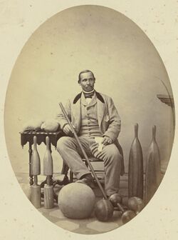 Director of the Harvard College Gymnasium ca. 1860, with a medicine ball and other equipment.