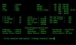 The player has many characteristics in the game. Some characteristics, like sex, weight, and height, cannot be changed once the player has been created, while other characteristics like strength, intelligence, and armor class can be modified by using certain items in a particular way. Mana and hit points are replenished by rest or by some other magical means. Gold accrues as the player steps on gems or currency. Experience accrues as the player performs various actions in the dungeon, mostly by killing creatures. The "miscellaneous abilities" are modified as each skill is performed and as the player increases in experience.