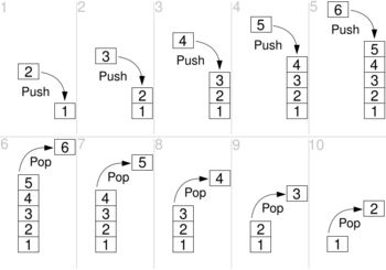 The order in which an element added to or removed from a stack is described as last in, first out, referred to by the acronym LIFO.[nb 1] As with a stack of physical objects, this structure makes it easy to take an item off the top of the stack, but accessing a datum deeper in the stack may require removing multiple other items first.[1]